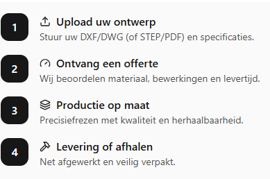 - Bestandsformaten: DXF/DWG (voorkeur), STEP, PDF ter referentie.